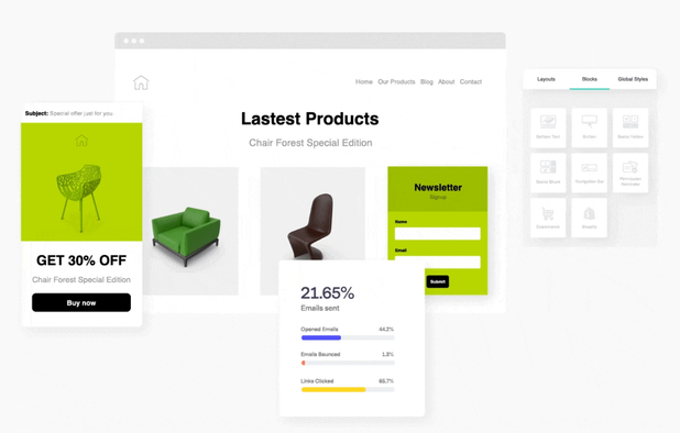 Design newsletters, websites, and landing pages using drag-and-drop builders, automate multi-step campaigns, analyze performance with detailed reports, sell digital products, sync with e-commerce platforms, and manage subscribers with segmentation and embedded forms.