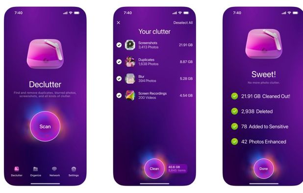 AI-driven app scans devices for duplicate, blurred, and unneeded photos, removing clutter, auto-sorting images into thematic folders, and freeing up storage.