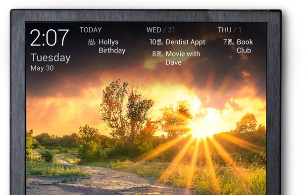 Customizable wall display syncs calendars, photos, news, weather, to-dos; supports smart home integration, multiple services, agenda views, and digital signage.
