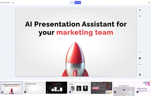 Cloud-based tool for editing and creating presentations with real-time collaboration, import of various formats, integration of images and videos, easy sharing and publishing to the web, history tracking, multiple template options, and offline editing extension.
