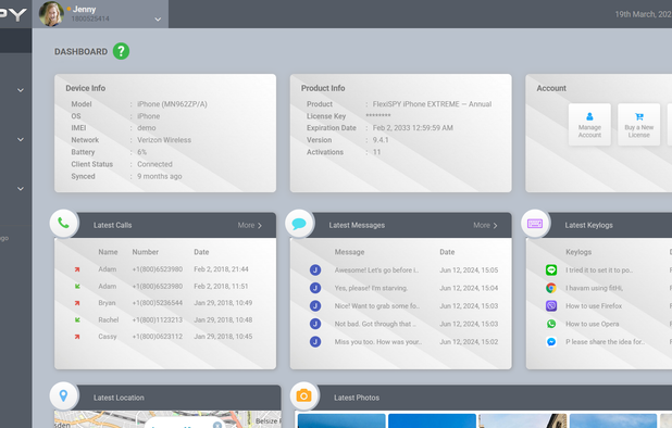 Remotely monitors calls, SMS, GPS location history, app activity, browsing, deleted messages, keylogs, and contacts, plus major social platforms, with live reporting, screenshot sharing, parental controls, and total stealth on Android and iOS devices.