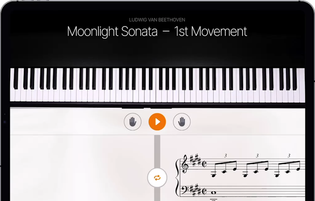 Offers interactive piano lessons with real-time feedback, color-coded notes, games with levels and rewards, friend-based competition, shareable scores and recordings, practice statistics tracking, backing track play-along, popular songs library, and MIDI keyboard support.
