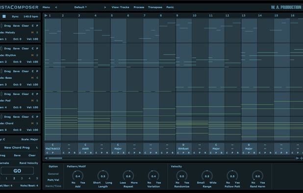 The backbone of Instacomposer is a behind-the-scenes decision making matrix that creates notes based on both mathematics and musical knowledge. Plus, the artificial intelligence factors in a whole host of parameters that you can set in the bottom panel, from repetition...