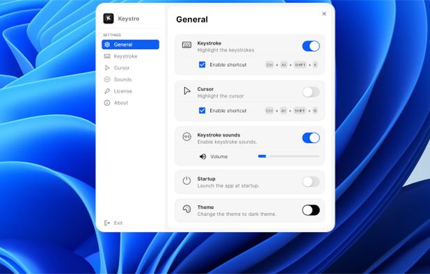 Customizable widget displays keystrokes and highlights your cursor with adjustable styles, themes, and placement, while realistic mechanical keyboard sounds enhance recordings on Windows and macOS.