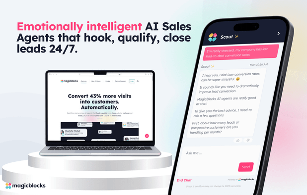 Earn 20-25% recurring commissions by referring MagicBlocks; affiliates share unique referral links; agency partners build custom solutions and earn commissions plus project fees ($5K-$15K+); perks include free sandbox account, discounts, $1000 bonus at $10K MRR milestones, marketing assets, exclusive community