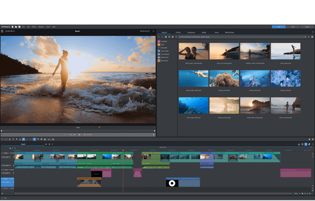 Non-linear editor for Windows supporting HD, 4K, and 360 video, unlimited tracks, advanced effects, multi-camera editing, screen recording, stop motion, enhanced keyframe controls, audio layering, split screen, selective color, and disc or web export.