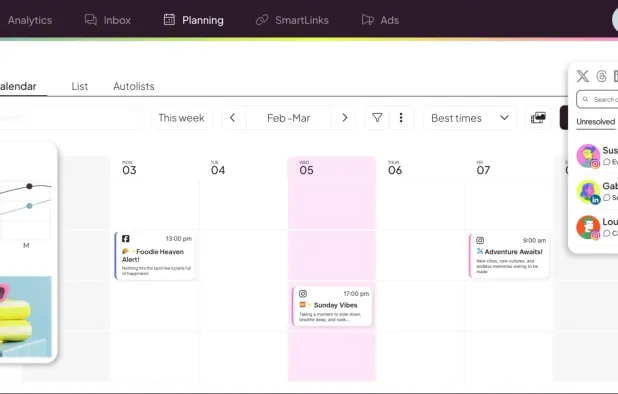 Manage multiple social platforms from a single dashboard by scheduling posts, analyzing performance, tracking mentions and comments, collaborating with teams, managing messages in a unified inbox, using a content planner, and publishing multimedia content on the go.