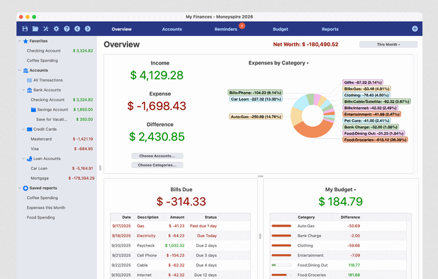 Comprehensive cross-platform personal finance app providing encrypted local data storage, online banking connectivity, bill pay, customizable budgets, investment tracking for various assets, multi-currency support, advanced graphs, payment reminders, and detailed financial reports.