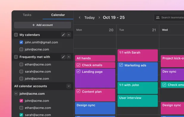 Unify meeting organization, task management, event scheduling, and project-based collaboration in a single workspace. Assign and track meeting action items, use collaborative agendas and notes, view teammate calendars, and keep team meetings focused and structured.
