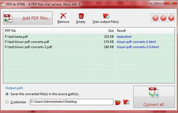 PDF to HTML is used t qouickly convert PDF files to HTML web pages in batch mode. It works without Adobe Acrobat or Adobe Reader, and has Command Line Interface (CLI), friendly interface, small size, accurate and fast conversion ability.