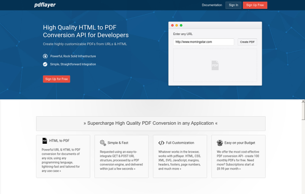 HTML to PDF API supporting URLs and raw HTML, customizable conversion, multiple programming languages, real browser engines, usage tracking, CDN storage.