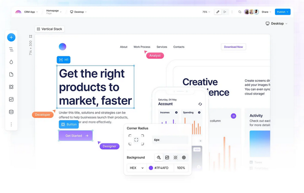 Combines code-driven and visual editing workflows for interactive UI design, high-fidelity prototyping, real-time team collaboration, reusable components, inline commenting, mobile previews on Android/iOS, and smooth developer handoff for efficient workflow.