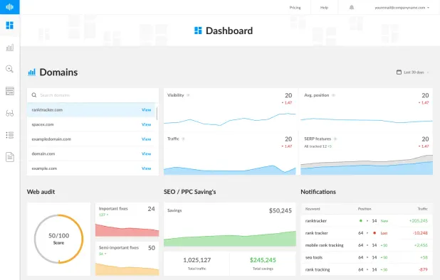 Comprehensive digital marketing platform providing over 55 tools for SEO, PPC, SMM, and campaign management. Features include keyword research, backlink analysis, AI-driven content creation, SERP tracking, and competitor analysis. Ideal for agencies, streamlining processes and automating reporting.