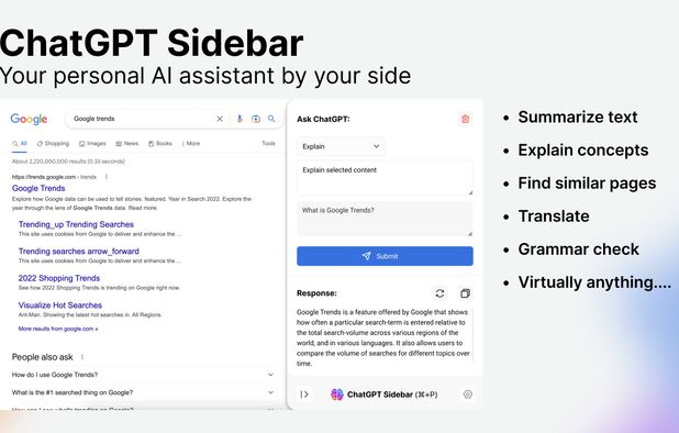 Freemium Chrome extension offering free GPT-4 access, on-page AI chatbot, document and YouTube summaries, AI writing for social media and Gmail, live web access, translations, and PDF, DOC, or PPT uploads for summarizing and chat, supporting varied professionals.