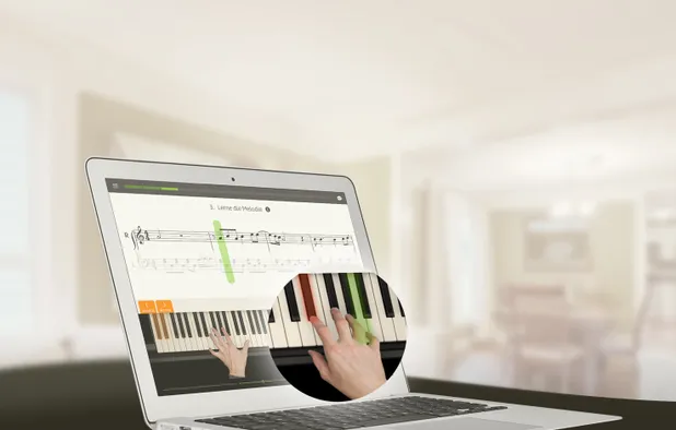 Comprehensive online piano training platform with interactive, step-by-step lessons, real-time feedback, synchronized video and sheet music, genre and difficulty filters, song saving, and live performances from professionals, all requiring just a tablet or fast laptop.