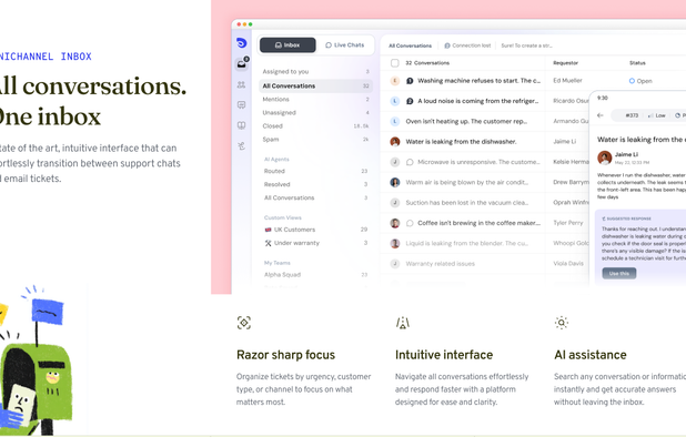 AI-driven service platform combining live chat, helpdesk ticketing, and automation. Supports web, mobile, Messenger, WhatsApp, and Shopify with easy setup, unified customer view, smart reply suggestions, fast onboarding, reporting, and performance analytics.