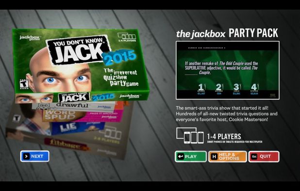 Pack of party games played using smartphones as controllers, hosted on a central screen, including trivia, drawing, and bluffing games for group gatherings.
