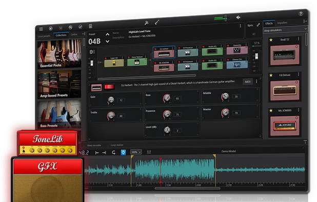 Collection of guitar amps, cabinets, and effects as standalone software or plugin, with advanced tone options, IR support, and low-latency recording.