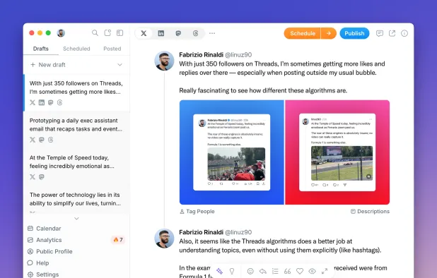 Handle multiple social accounts, schedule content with customizable posting times, use browser extensions for instant sharing, review post analytics, and collaborate in teams. Streamline workflows with centralized scheduling, performance metrics, and easy profile management.