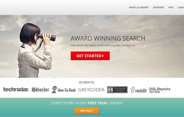 Web-based Usenet service offers searching, sorting, file previews, both NNTP and HTTPS, SSL encryption, VPN with 100+ locations, ad-free access, 99.5% article completion, 5,857+ days retention, image and video player, no logs, and rollover gigs.
