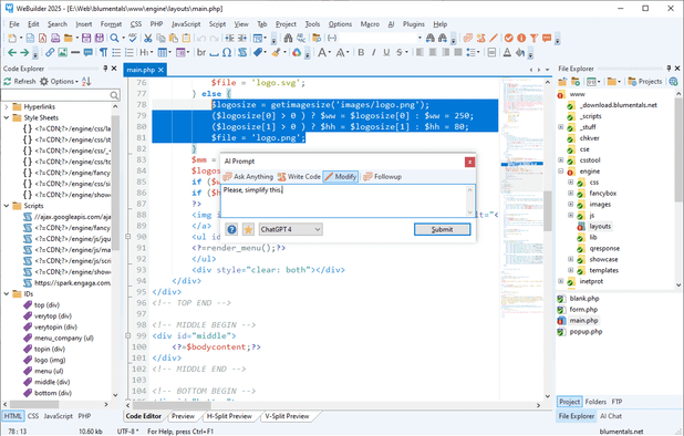 HTML, CSS, JavaScript editor featuring AI-assisted code improvements, HTML validator, spell check, FTP access, snippet library, and multi-browser previews for effective web development.